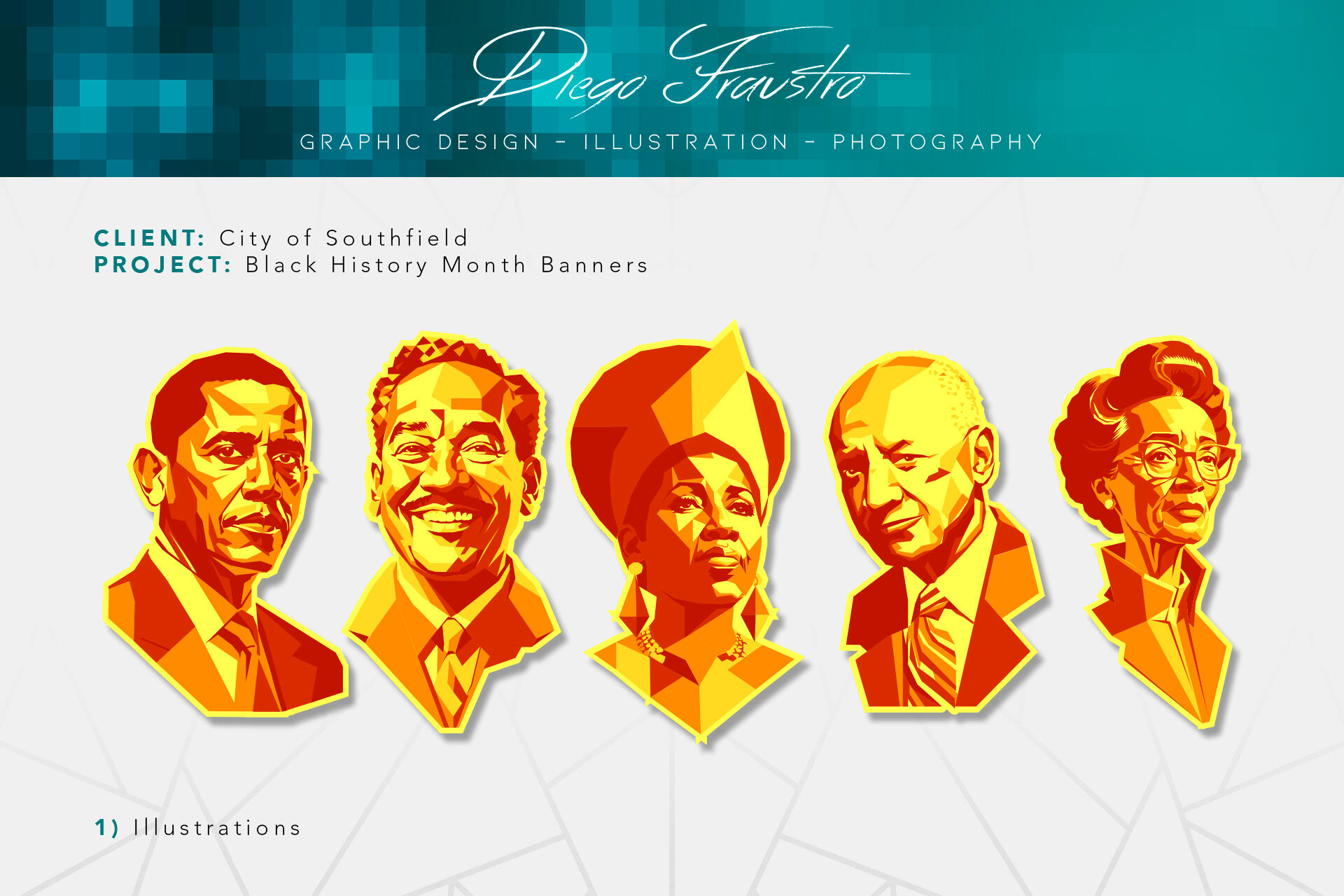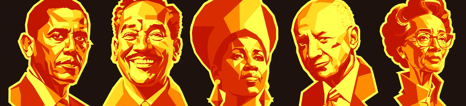 This project was assigned at the same time as the banners for Dr. King, and given the significance of Black History Month in my city, I knew I had to create something that truly honored the community. From the start, I knew the illustrations had to align with the style of the Dr. King banners, but this one took a lot more brainstorming because, honestly, I had no idea where to begin. Then, one day, the idea came to me: I would feature five prominent figures whose initials spelled out the word 'BLACK.' After doing some research, I decided on the following individuals:Barack Obama